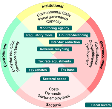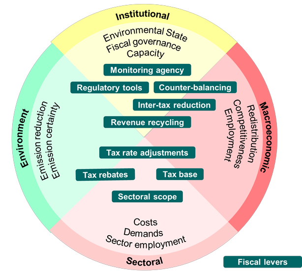 Outcomes of the identified fiscal policies can be assessed in environmental, macroeconomic, sectoral and institutional dimensions (Figure 2). The environmental outcomes relate to carbon reduction effects, emissions certainty, and reduction of non-CO2 GHG (Lee et al, 2012; Mortha et al, 2021; Murray et al, 2017; Pereira et al, 2016).