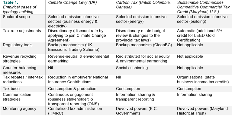 Successful implementation of any fiscal levers is conditioned by the capacity of environmental state. Environmental state is “a significant set of institutions and practices dedicated to the management of the environment and societal-environmental interactions”, which highlights “the agency of the state, as well as historically defined patterns of state institutionalisation that structure political interaction” (Duit et al, 2016; Mol & Buttel, 2002). Studies argued that the UK Treasury placed small priority on curbing carbon emissions in the conduct of fiscal policy (Craig, 2018). After the introduction of UK Net Zero Strategy in 2021, the policy environment and hence the environmental state have substantially altered. It is apt for a more comprehensive global case review structured by a valid analytical framework.