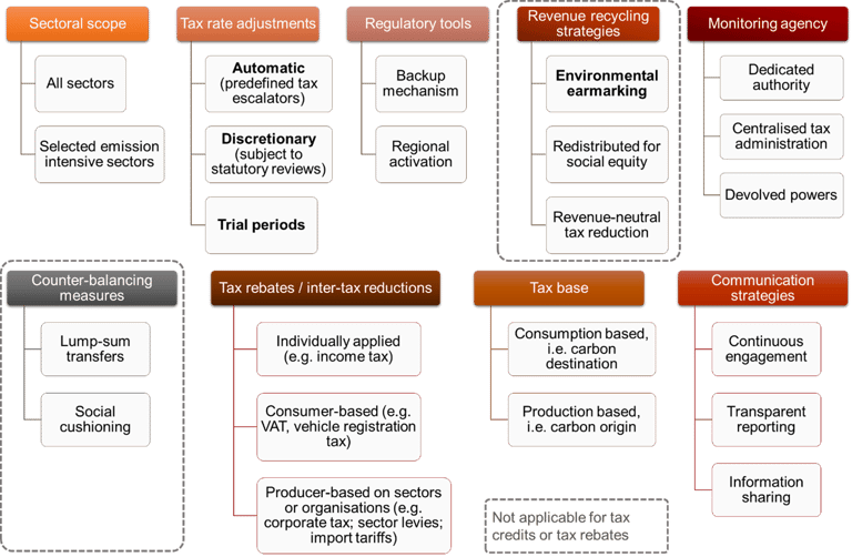 Revenue recycling strategies are another key features of any Pigovian tax policies. The additional revenues can be environmentally earmarked to fund other emission reduction projects, redistributed to achieve a fairer (less fiscally regressive) outcome, or spent on reduction of other taxes to achieve a revenue-neutral outcome (Carattini et al, 2018; Murray et al, 2017). To redistribute the revenues, counter-balancing measures can be devised to mitigate disproportionate negative impact on low-income or remote households with either lump-sum transfers or social cushioning (Carattini et al, 2018). For the revenue-neutral outcome, it is feasible to couple carbon tax with other taxes imposed on individuals, organisations, consumers or producers, such as VAT (Andersson, 2019) or income tax (Lee et al, 2012). Given the various revenue recycling strategies, different fiscal policy designs can create environmental, institutional and/ or macroeconomic impacts.