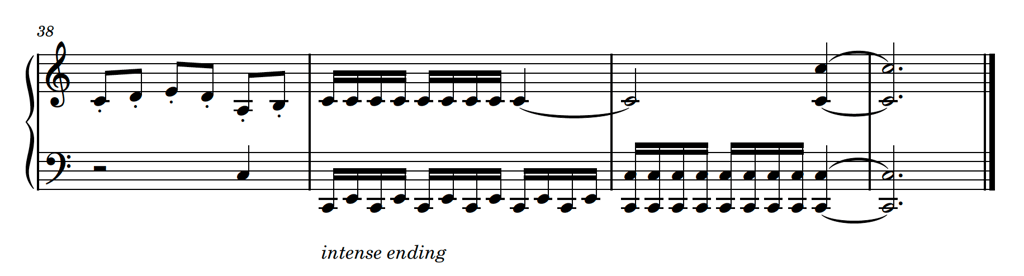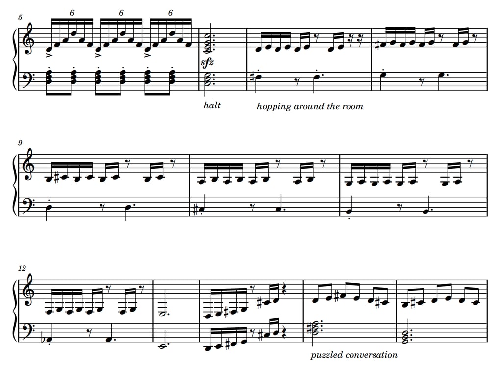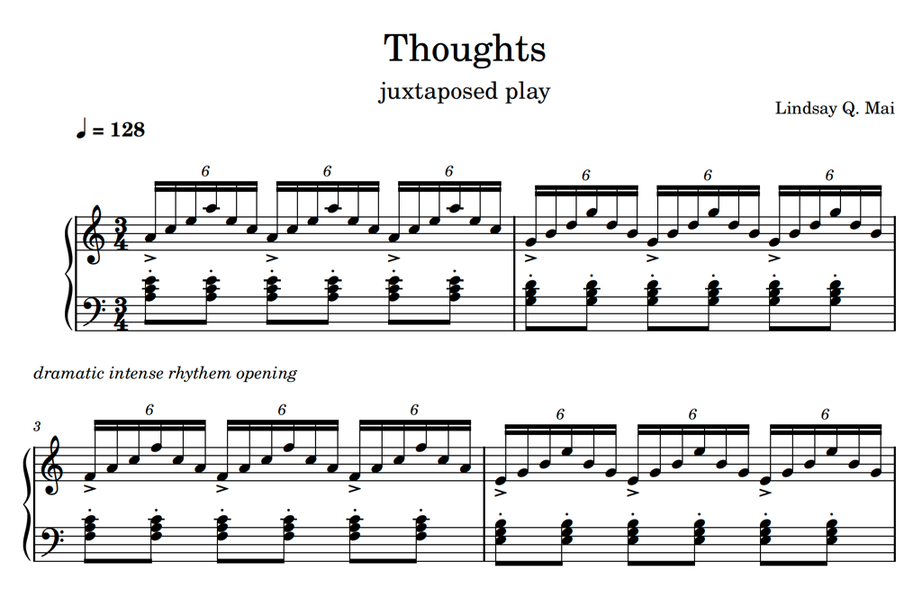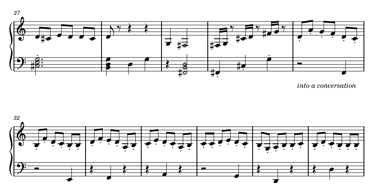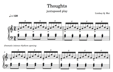 The opening melody of this short musical piece came to my fingertips when I was conducting a piano music lesson with a child with developmental challenges. The rhythm and melody mimic the usual encounters during this series of lessons. Those arrays of arpeggios in the right-hand part require quick flow of finger movement to create the dramatic yet elegant feeling of the opening melody (Bar 1-5). The left-hand part is composed to accompany those opening flows as added rhythmic beats, which should be played with softer yet precise beats. The "puzzled conversation" and "into a conversation" parts represent changes of the main storyline of this musical piece, which mimics the conversation we had through musical notes on the piano during our sessions.